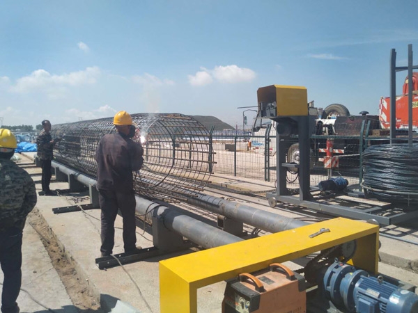 2、鋼筋籠12米以上,或者單節(jié)鋼筋籠較重時,骨架中間加焊1、2圈纏繞筋替代第三個過渡箍。或直接中間開始繞筋,另半截籠前面向中間纏繞連接完成。所以三個過渡箍的中間一個箍應置放在中間靠后面的地方,借以減少沖擊振動。退出輥輪并過渡到后面輥輪的方法--將過渡箍向后面推壓,讓過渡箍順膠輥旋轉到上面直到全部退出。準備臺架;若采用骨架直接滾進輥輪內檔(小型鋼筋籠),骨架制作臺架高度與設備同高。